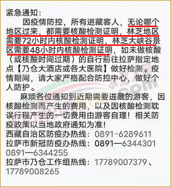 西藏地區(qū)緊急通知∶因疫情防控,所有進藏客人,無論哪個地區(qū)過來,都需要核酸檢測證明,林芝地區(qū)需要72小時內(nèi)核酸檢測證明,林芝大峽谷景區(qū)需要48小時內(nèi)核酸檢測證明,如未做核酸(或核酸時間過期)的自行前往拉薩指定地點做好檢測。