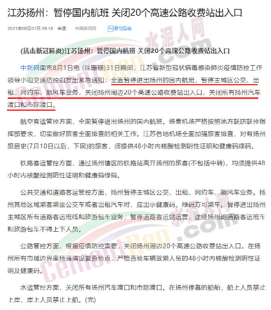 7月31日晚間,江蘇省新型冠狀病毒感染肺炎疫情防控工作領導小組交通防控組發(fā)出緊急通知:全面暫停進出揚州的國內(nèi)航班,暫停主城區(qū)公交、出租、網(wǎng)約車、順風車業(yè)務,關閉揚州周邊20個高速公路收費站出入口,關閉所有揚州汽車渡口和市際渡口。