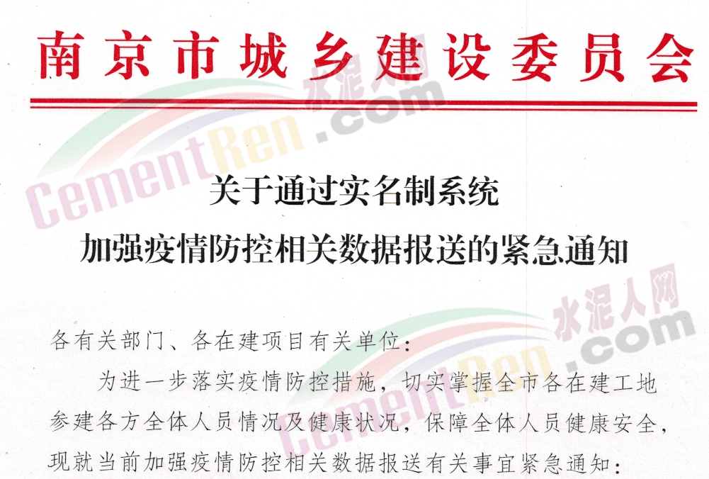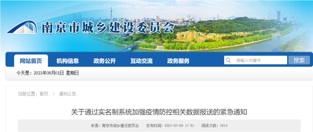 江蘇南京市城鄉(xiāng)建設委員會發(fā)布《關于通過實名制系統(tǒng)加強疫情防控相關數(shù)據(jù)報送的緊急通知。
