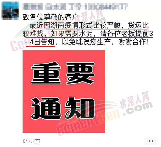 日前,葛洲壩石門特種水泥有限公司通知,最近因湖南疫情形勢(shì)比較嚴(yán)峻,貨運(yùn)比較難找,如果需要水泥,請(qǐng)?zhí)崆?-4日告知,以免耽誤生產(chǎn)。