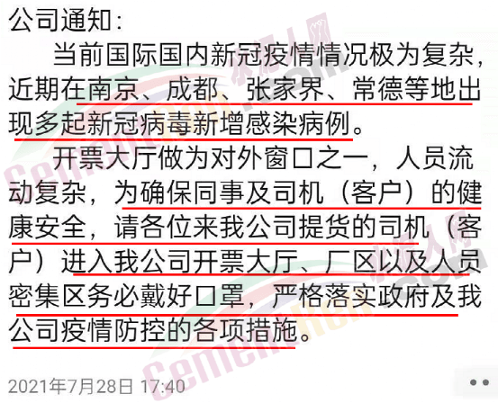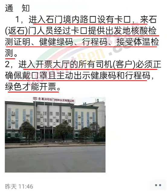 據(jù)水泥人網(wǎng)了解,企業(yè)近兩日連續(xù)發(fā)布提示通知,提示車輛進(jìn)入石門境內(nèi)路口設(shè)有卡口,來(lái)往人員經(jīng)過(guò)卡口需提供出發(fā)地核酸檢驗(yàn)證明、健康綠碼、行程碼并接受體溫檢測(cè)。同時(shí)進(jìn)入開(kāi)票大廳的所有司機(jī)(客戶)必須正確佩戴口罩,主動(dòng)出示健康碼,行程碼,綠色才能開(kāi)票。