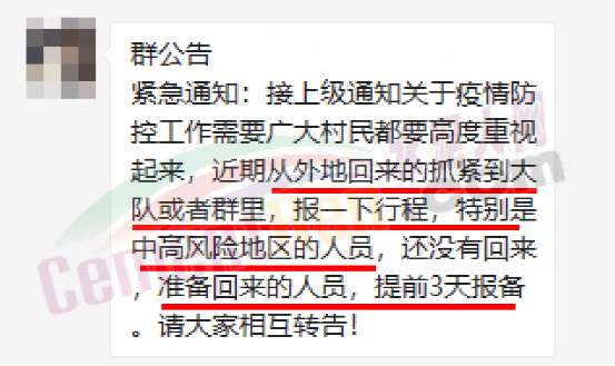 據(jù)上述銷售人員反饋,村里發(fā)了緊急通知稱,接到上級(jí)通知,要求從外地回村的人員抓緊報(bào)備行程,特別是從中高風(fēng)險(xiǎn)地區(qū)返回的人員。還沒(méi)有回來(lái)的,準(zhǔn)備回來(lái)的人員,提前3天報(bào)備。