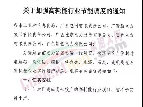 日前,廣西壯族自治區(qū)工信廳發(fā)布《關(guān)于加強(qiáng)高耗能行業(yè)節(jié)能調(diào)度的通知》給各市工業(yè)和信息化局,廣西電網(wǎng)有限責(zé)任公司、廣西新電力集團(tuán)有限責(zé)任公司、廣西桂東電力股份有限公司、百色電力有限責(zé)任公司、百色新鋁電力有限公司稱,為緩解當(dāng)前電力緊張形勢(shì),決定從9月份起對(duì)電解鋁、氧化鋁、鋼鐵、鐵合金、水泥、石灰、建筑陶瓷等高耗能企業(yè)實(shí)行限產(chǎn)措施。