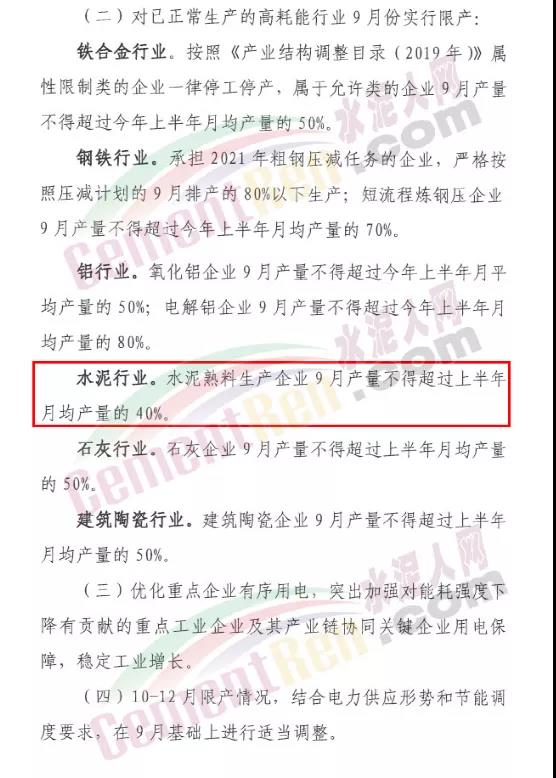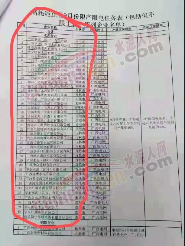 水泥行業(yè)水泥熟料生產(chǎn)企業(yè)9月產(chǎn)量不得超過(guò)上半年月均產(chǎn)量的40%。涉及的水泥企業(yè)包括華潤(rùn)水泥、海螺水泥、南方水泥、紅獅水泥、魚峰水泥、虎鷹水泥、東泥天等、融水東立建材等共41家。