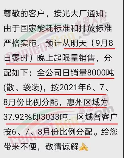 9月7日光大水泥廠通知:由于國(guó)家能耗標(biāo)準(zhǔn)和排放標(biāo)準(zhǔn)嚴(yán)格實(shí)施,預(yù)計(jì)從今日(9月8日)零時(shí)起限量銷售:全公司日銷量8000噸(散、袋裝),按2021年6、7、8月份比例分配,惠州區(qū)域?yàn)?7.92%即3033噸,區(qū)域各客戶按6、7、8月份比例分配。