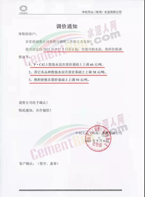 9月7日中材天山(珠海)水泥有限公司對(duì)水泥、熟料價(jià)格上調(diào)50-60元/噸。