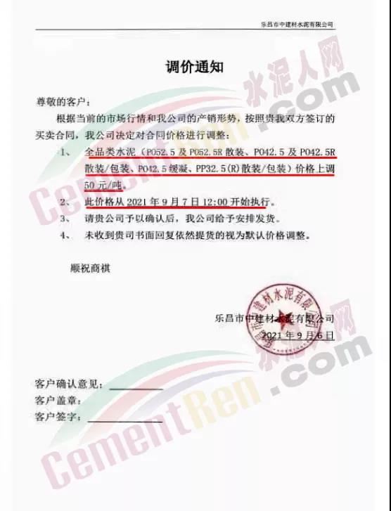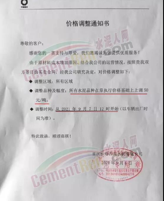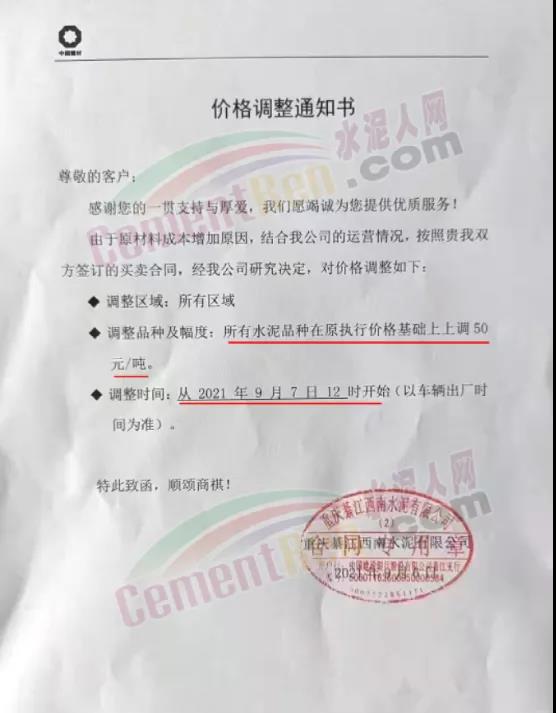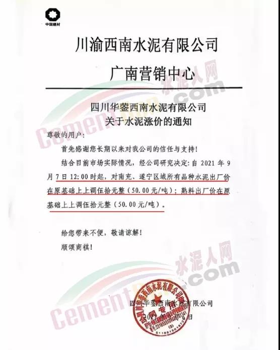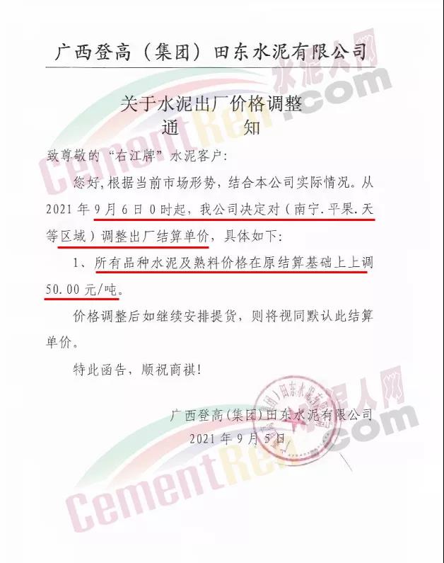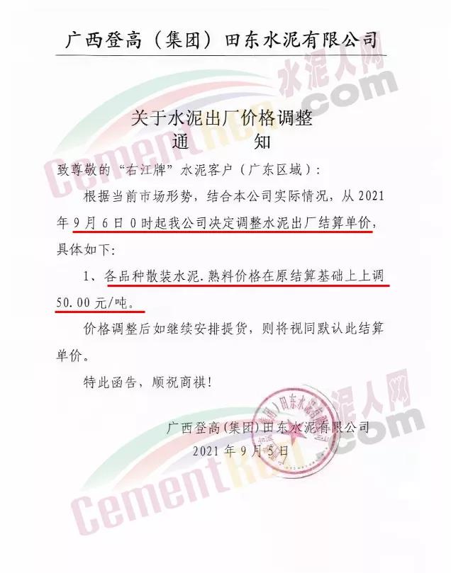 9月5日華潤(rùn)水泥對(duì)發(fā)往南寧北區(qū)域以及平南方向各品種水泥價(jià)格上調(diào)50元/噸。