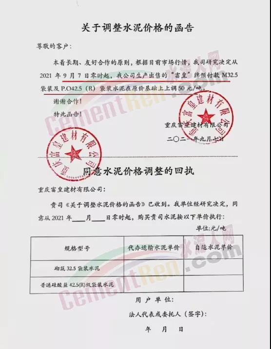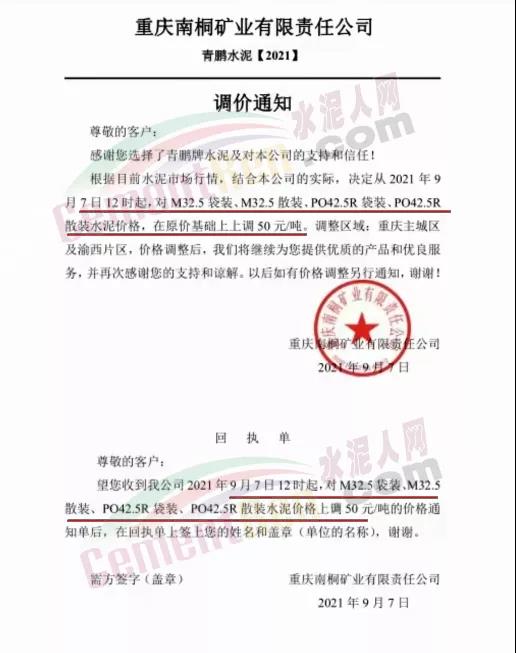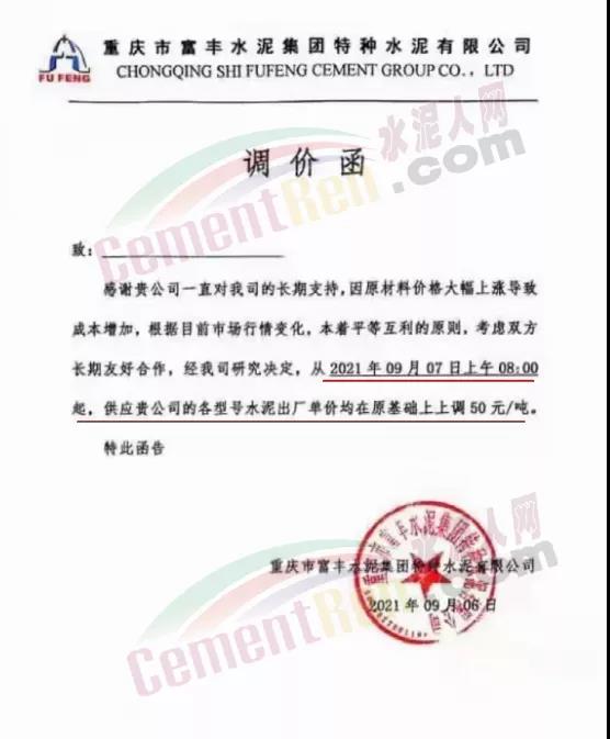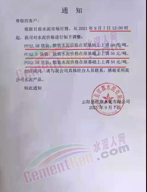 9月7日重慶綦江西南水泥、長(zhǎng)壽西南水泥、臺(tái)泥重慶公司等9家企業(yè)通知上調(diào)各標(biāo)號(hào)水泥價(jià)格50元/噸