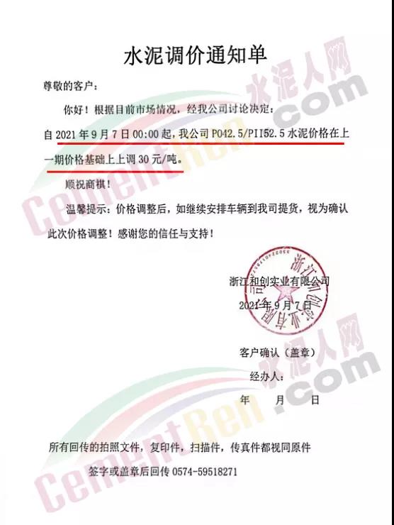 9月7日華東區(qū)域貿(mào)易商浙江和創(chuàng)實(shí)業(yè)有限公司通知PO42.5和PII52.5水泥上調(diào)30元/噸。