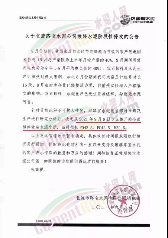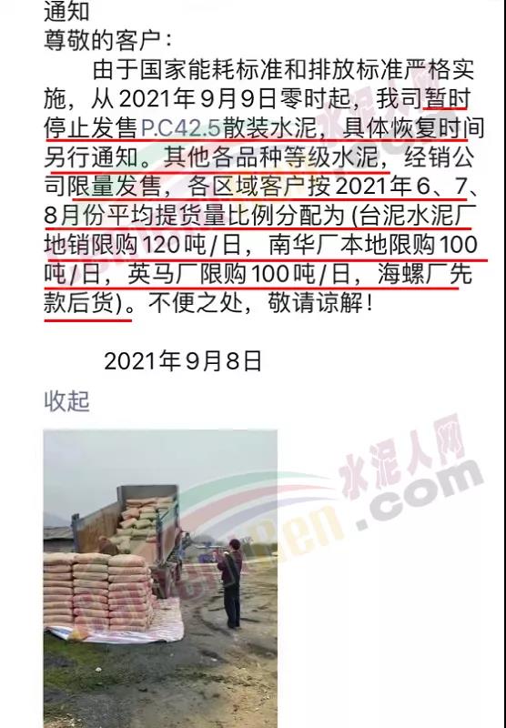 9月8日,有經(jīng)銷商通知稱,由于國家能耗標準和排放標準嚴格實施,從2021年9月9日零時起,公司暫時停止發(fā)售PC42.5散裝水泥,具體恢復時間另行通知。其他品種等級水泥,經(jīng)銷公司限量發(fā)售,各區(qū)域客戶按2021年6、7、8月份平均提貨量比例分配。其中,臺泥水泥廠地銷限購120噸/日,南華廠本地限購100噸/日,英馬廠限購100噸/日,海螺廠先款后貨。
