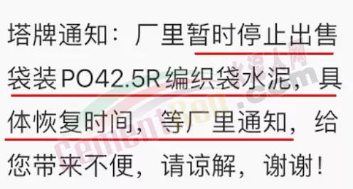 塔牌水泥通知,廠里暫時停止出售袋裝PO42.5R編織袋水泥,具體恢復時間,等廠里通知。