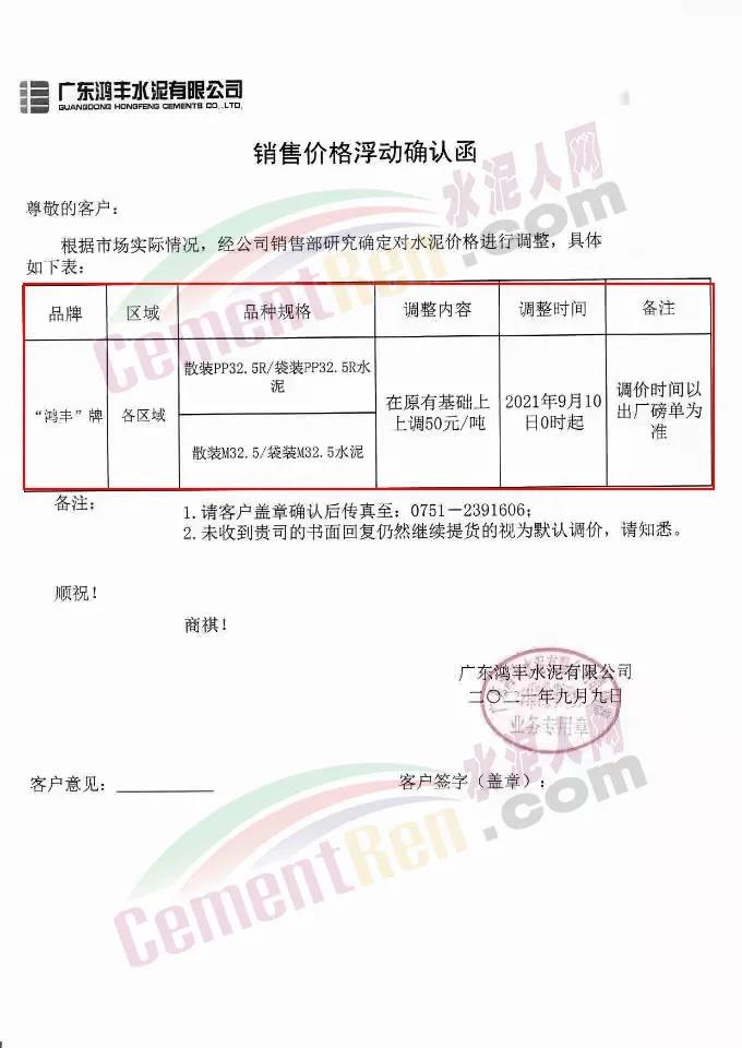 廣東鴻豐水泥有限公司通知,根據(jù)市場實際情況,經(jīng)公司銷售部研究確定自9月10日0時起,對各區(qū)域“鴻豐”牌水泥在原有基礎上上調50元/噸。