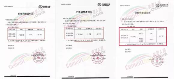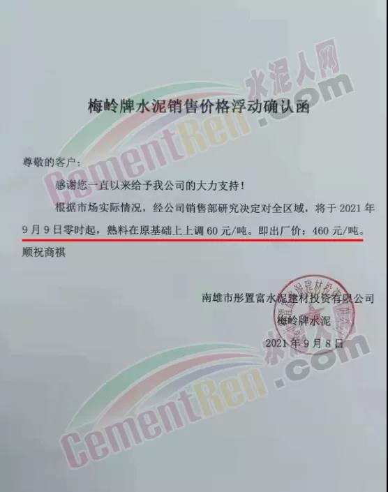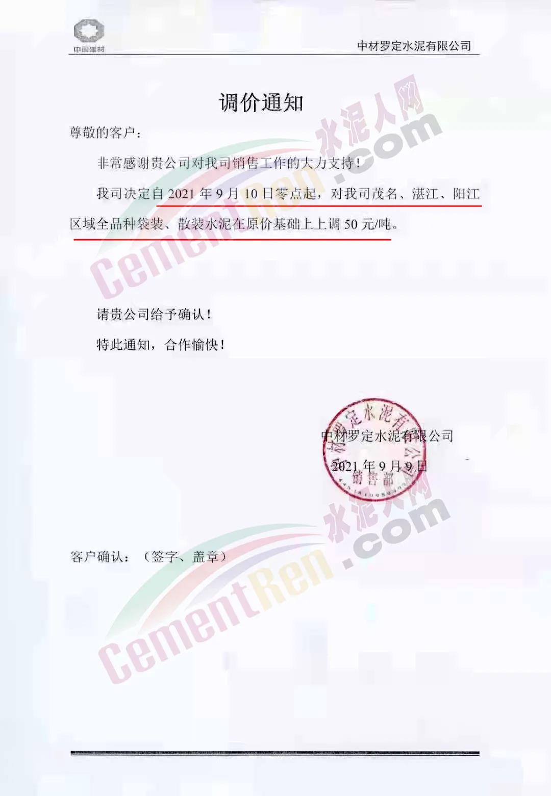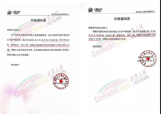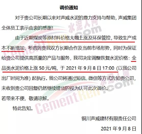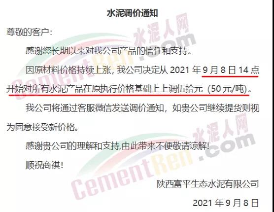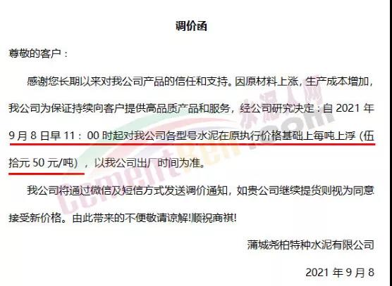 蒲城堯柏特種水泥有限公司通知因原材料上漲,生產(chǎn)成本增加,經(jīng)公司研究決定自9月8日早11時起對公司各型號水泥在原執(zhí)行價格基礎上每噸上浮50元/噸。