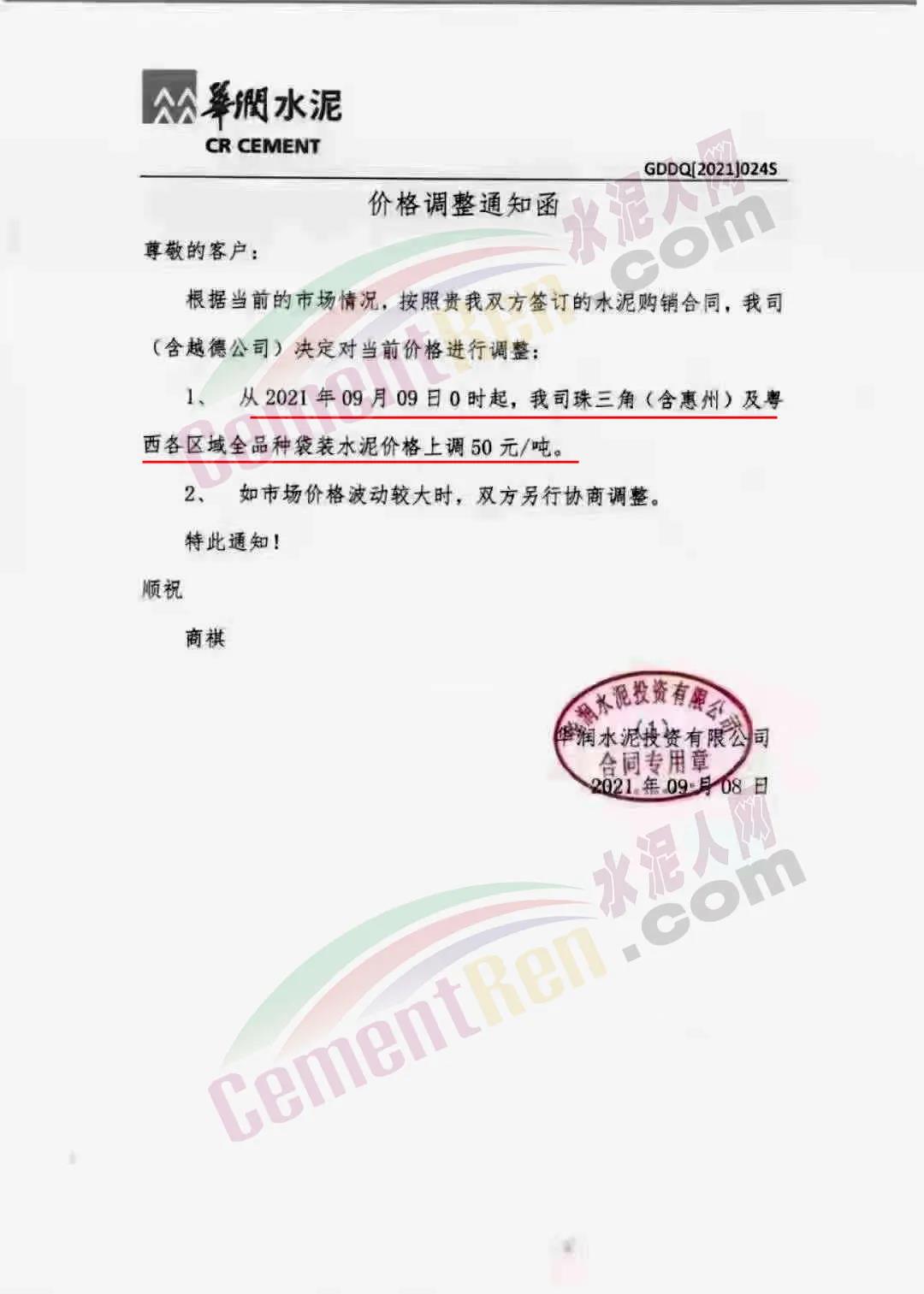 華潤水泥投資有限公司通知 ,自9月9日0時起,公司珠三角(含惠州)及粵西各區(qū)域全品種袋裝水泥價格上調50元/噸。