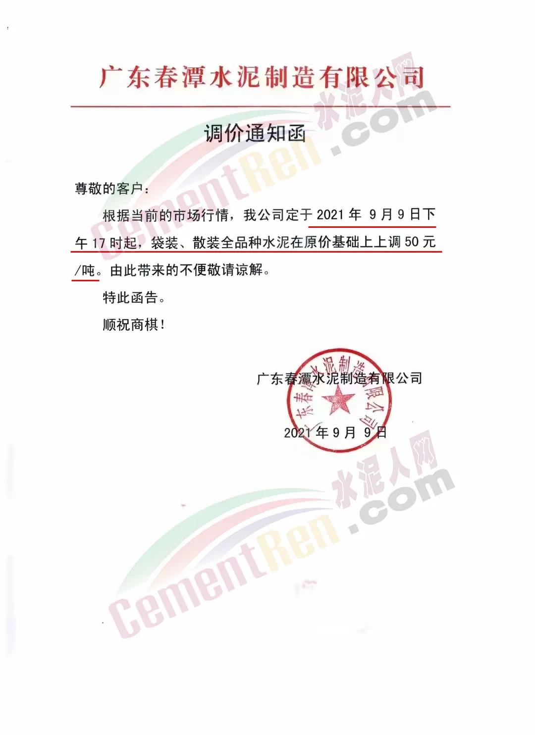 廣東春潭水泥制造有限公司通知,定于9月9日下午17時起,袋裝、散裝水泥在原價基礎上上調50元/噸。