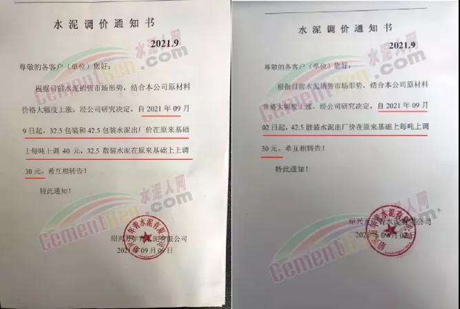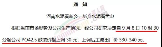 河南全省在9月3日上調30元/噸后于9月7日下午17時再次通知水泥價格上調30元/噸,本月兩次漲價,累計上調50-60元/噸。