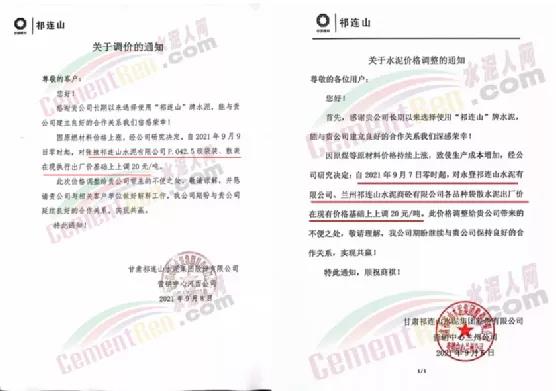甘肅祁連山水泥集團股份有限公司營銷中心河西公司通知,因原燃材料價格上漲,經(jīng)公司研究決定,自2021年9 月9日零時起,對張掖祁連山水泥有限公司P.042.5級袋裝、散裝在現(xiàn)執(zhí)行出廠價基礎上上調 20元/噸。據(jù)了解,近幾日甘肅省內(nèi)主要品牌企業(yè)陸續(xù)上調水泥價格20-30元/噸。