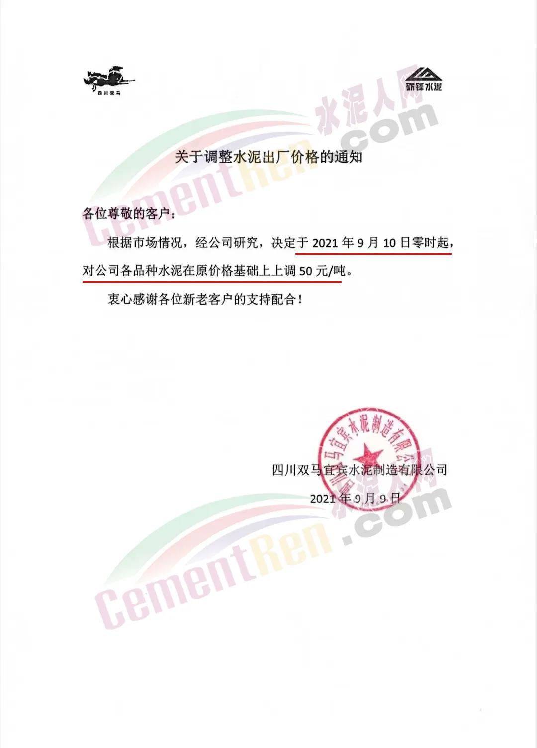 四川雙馬宜賓水泥制造有限公司通知,根據(jù)市場情況,經(jīng)公司研究決定于9月10日零時起,對公司各品種水泥在原價格基礎上上調50元/噸。