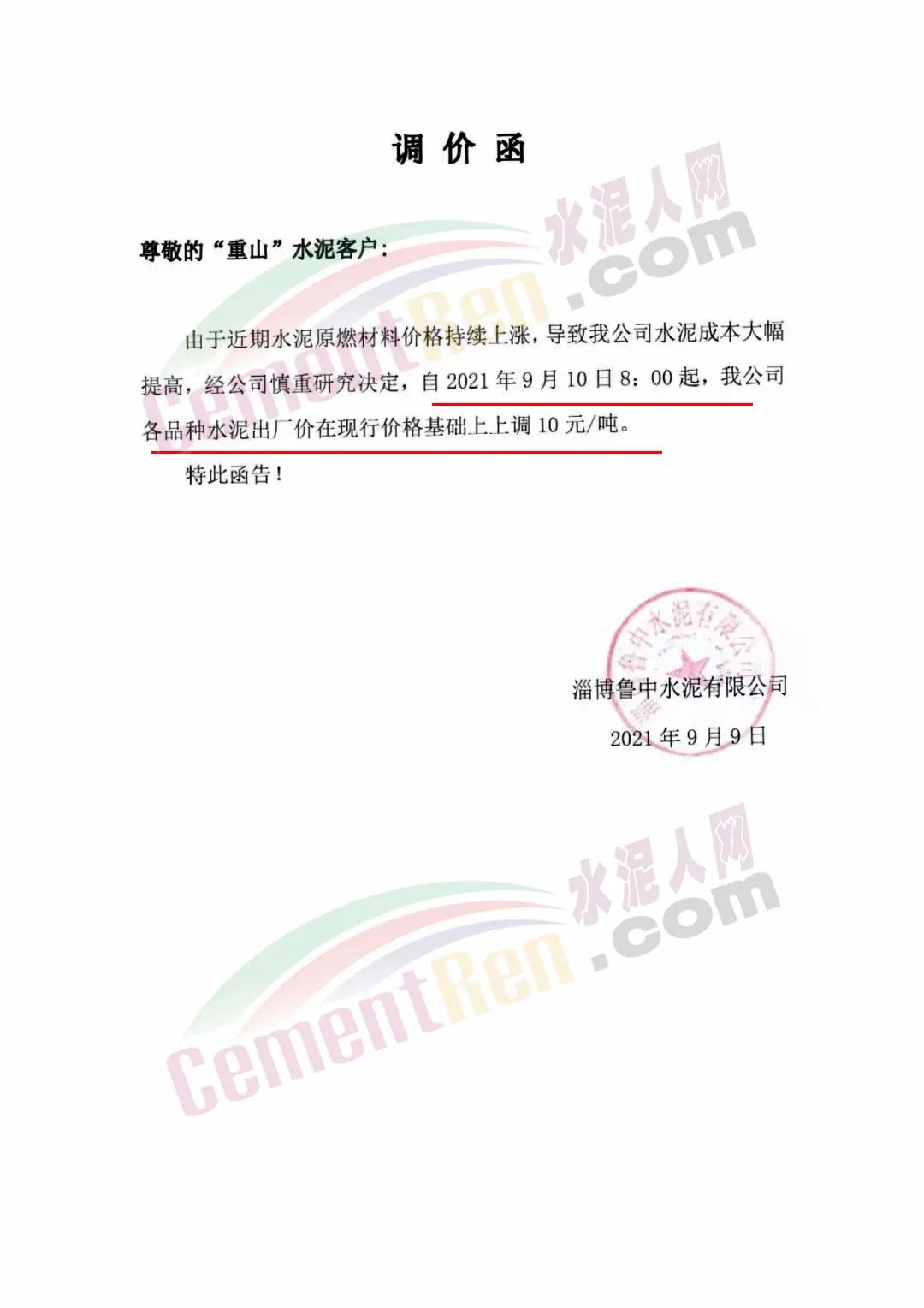 山東淄博魯中水泥有限公司通知,由于近期水泥原燃材料價格持續(xù)上漲,導致公司水泥成本大幅提高,經(jīng)公司慎重研究決定,自9月10日8時起,公司各品種水泥出廠價在現(xiàn)行價格基礎上上調10元/噸。