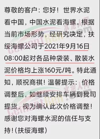 扶綏海螺通知,于9月16日8時(shí)起對各品種袋裝、散裝水泥價(jià)格均上漲160元/噸。