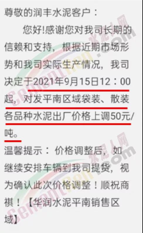 華潤水泥平南銷售區(qū)域通知,根據(jù)近期市場形勢和公司實(shí)際生產(chǎn)情況,決定于2021年9月15日12時(shí)起,對發(fā)平南區(qū)域袋裝、散裝各品種水泥出廠價(jià)格上調(diào)50元/噸。