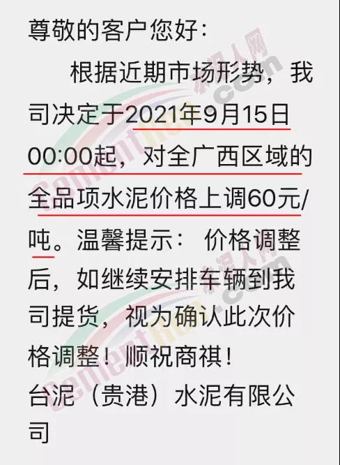 臺(tái)泥(貴港)水泥有限公司通知,自9月15日0時(shí)起,對全廣西區(qū)域全品項(xiàng)水泥價(jià)格上調(diào)60元/噸。