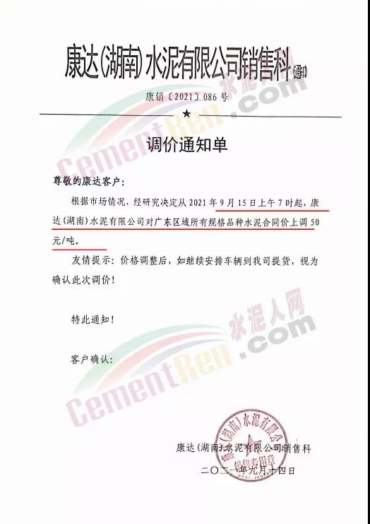 湖南江華海螺通知,9月10日起對P.O42.5袋裝水泥價(jià)格上調(diào)125元/噸;P.O42.5散裝水泥價(jià)格上調(diào)110元/噸。9月15日再次通知,各品種水泥上調(diào)50元/噸。5日兩次上調(diào),P.O42.5散裝水泥累計(jì)漲價(jià)150元/噸。