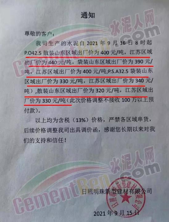 日照明珠新型建材有限公司通知自9月16日8時(shí)起P.O42.5散裝山東區(qū)域出廠價(jià)為400元/噸,江蘇區(qū)域出廠價(jià)為440元/噸,袋裝山東區(qū)域出廠價(jià)為390元/噸,江蘇區(qū)域出廠價(jià)為400元/噸;PS.A32.5袋裝山東區(qū)域出廠價(jià)為330元/噸,江蘇區(qū)域出廠價(jià)為340元/噸,散裝山東區(qū)域出廠價(jià)為320元/噸,江蘇區(qū)域出廠價(jià)為330元/噸(此次價(jià)格調(diào)整不接收100萬以上預(yù)付款)。