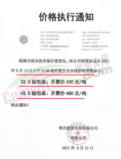 江蘇常州盤固水泥有限公司銷售公司通知,9月15日上午9時(shí)對公司水泥價(jià)格進(jìn)行調(diào)整,調(diào)整后42.5包裝開票價(jià)480元/噸。