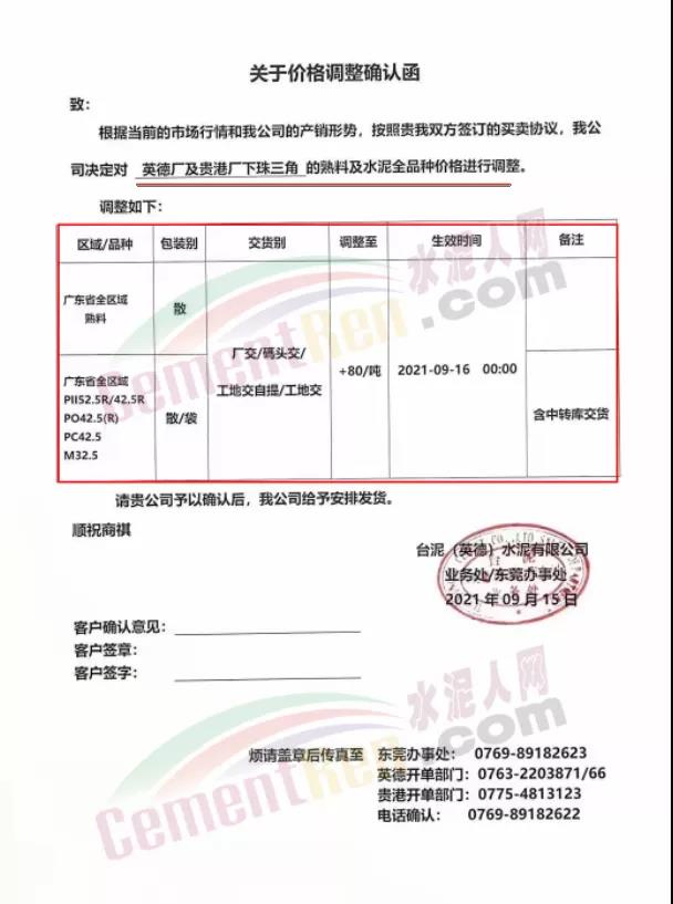 臺(tái)泥(英德)水泥有限公司通知,自9月16日0時(shí)起,英德廠及貴港廠下珠三角的熟料及水泥全品種價(jià)格上調(diào)80元/噸。