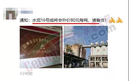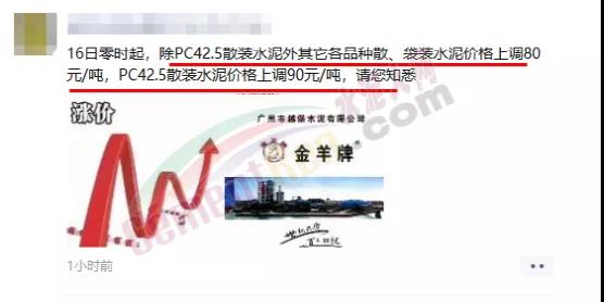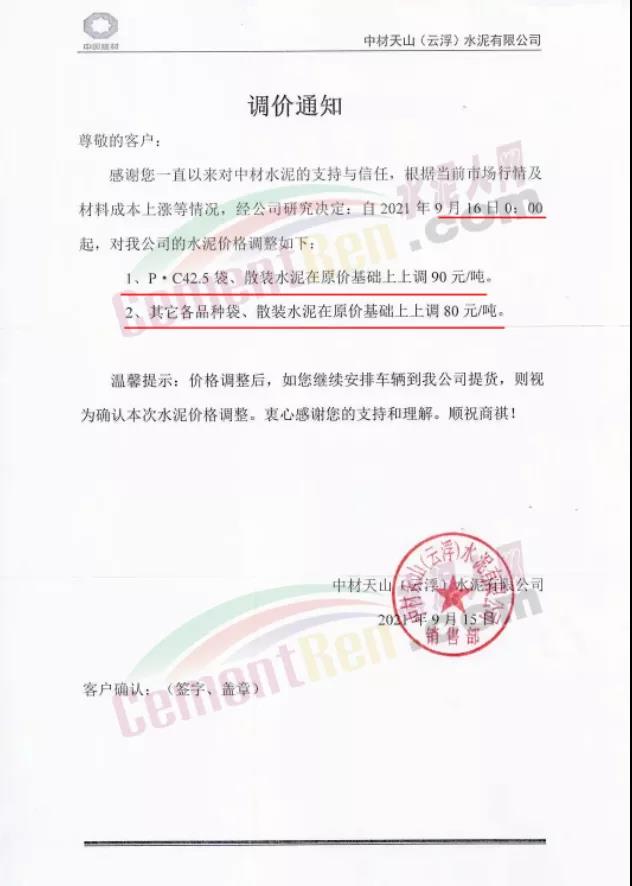 中材天山(云?。┧嘤邢薰就ㄖ?月16日0時(shí)起P.C42.5級水泥上調(diào)90元/噸,其他各品牌水泥上調(diào)80元/噸。