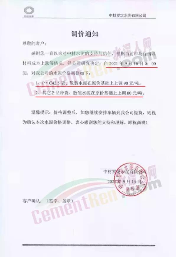 中材羅定水泥有限公司通知9月16日0時(shí)起P.C42.5袋、散裝水泥上調(diào)90元/噸。其他各品種袋裝、散裝水泥上調(diào)80元/噸。