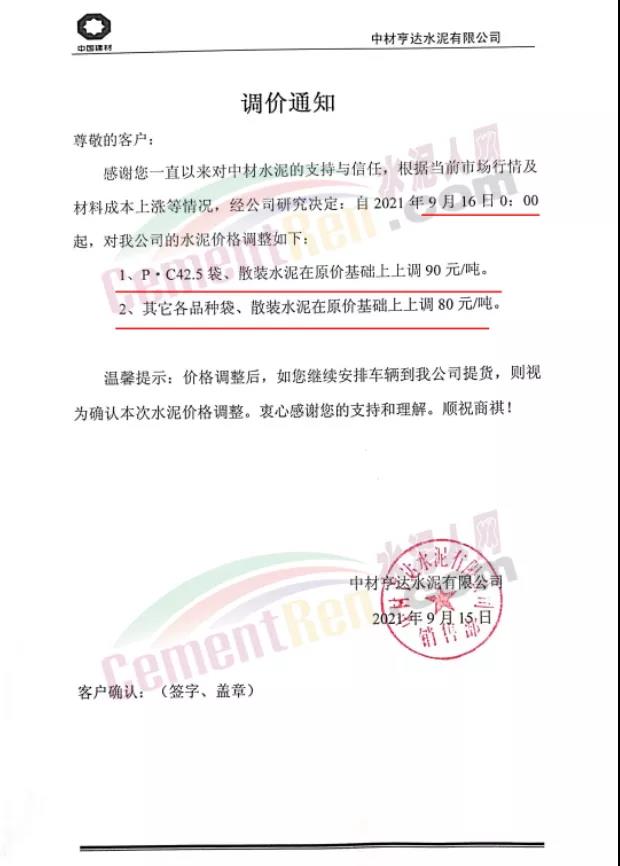 中材亨達(dá)水泥有限公司通知,9月16日0時(shí)起P.C42.5袋、散裝水泥上調(diào)90元/噸。其他各品種袋裝、散裝水泥上調(diào)80元/噸。