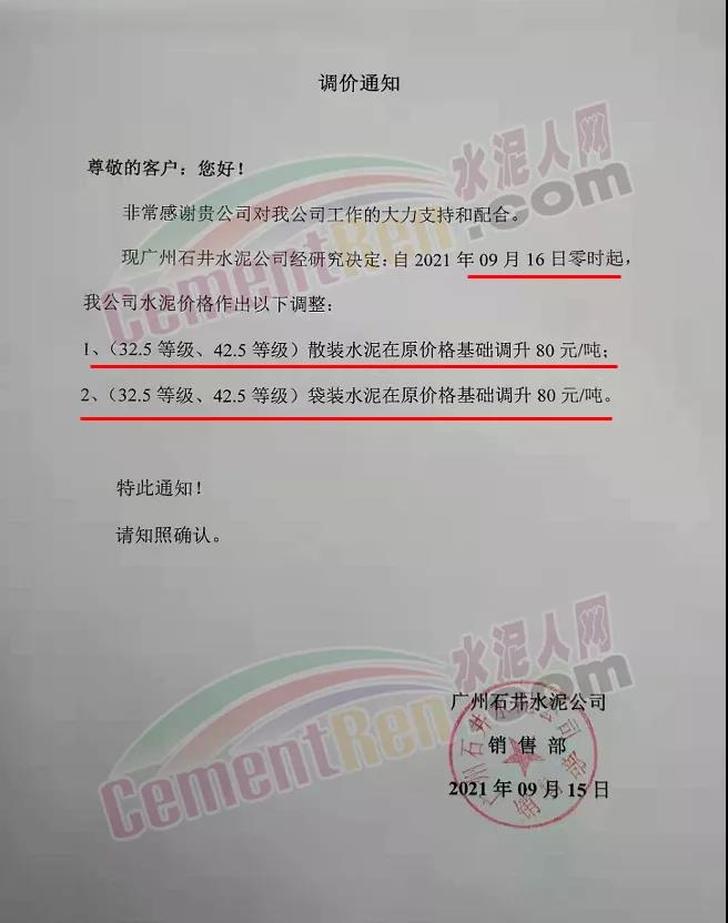 廣州石井水泥公司通知,9月16日0時(shí)起,各標(biāo)號水泥上調(diào)80元/噸。
