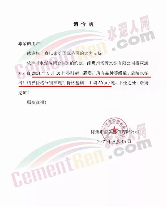 梅州市塔牌水泥通知自9月16日0時(shí)起,惠塔廠所有品種水泥上調(diào)80元/噸。