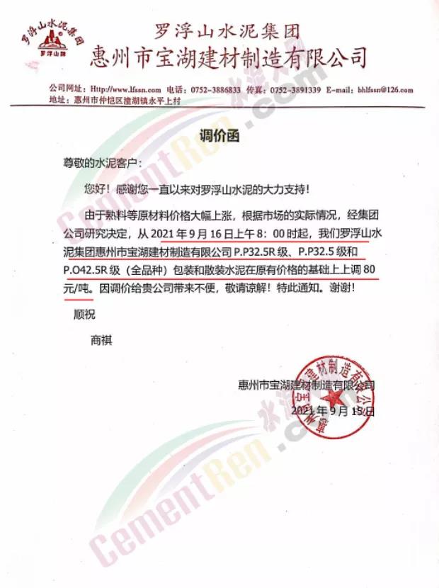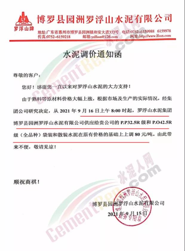 博羅縣園洲羅浮山水泥有限公司通知,9月16日上午8時(shí)起各標(biāo)號水泥上調(diào)80元/噸。