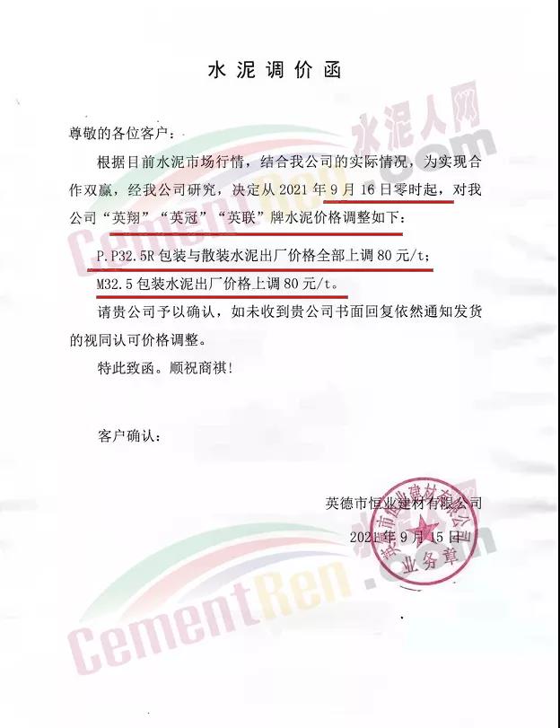 英德市恒業(yè)建材有限公司通知9月16日零時(shí)起,公司各標(biāo)號水泥上調(diào)80元/噸。