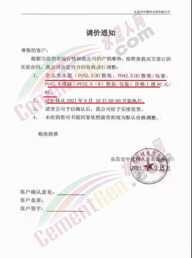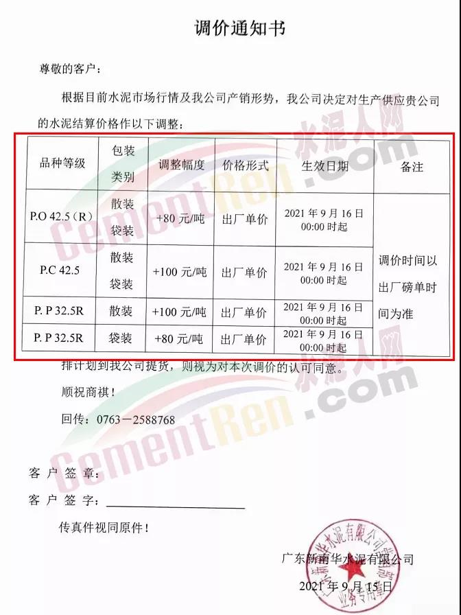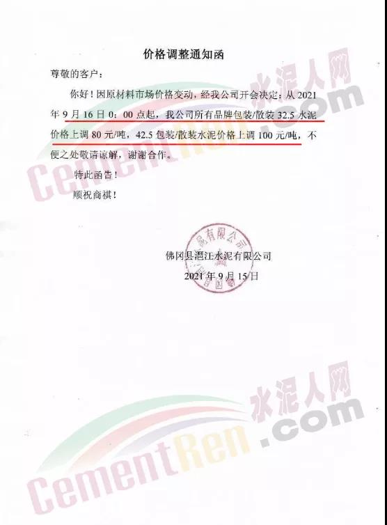 佛岡縣潖江水泥有限公司通知9月16日0時(shí)起,公司所有包裝/散裝32.5水泥價(jià)格上調(diào)80元/噸,42.5包裝/散裝水泥價(jià)格上調(diào)100元/噸。