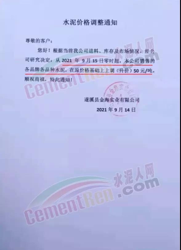 廣東省湛江市遂溪縣金海實(shí)業(yè)有限公司通知9月15日0時(shí)起,公司銷售各品牌各品種水泥,在原價(jià)格基礎(chǔ)上上調(diào)50元/噸。