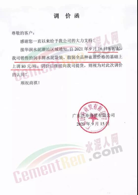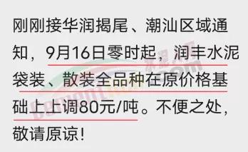 華潤揭尾、潮汕區(qū)域通知,9月16日零時(shí)起,潤豐水泥袋裝、散裝全品種在原價(jià)格基礎(chǔ)上上調(diào)80元/噸。