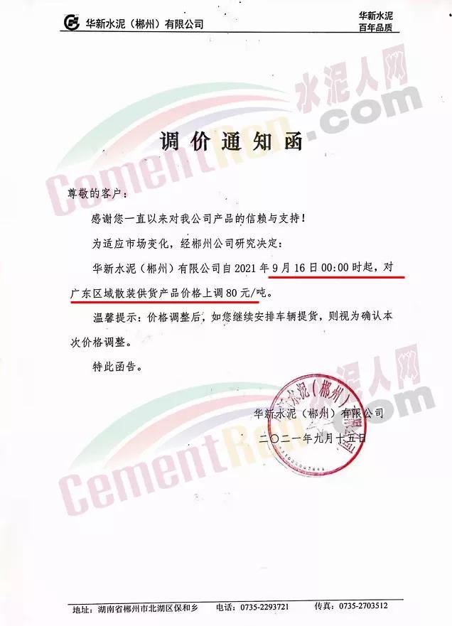 華新水泥(郴州)有限公司通知,9月16日0時(shí)起,對廣東區(qū)域散裝供貨價(jià)上調(diào)80元/噸。
