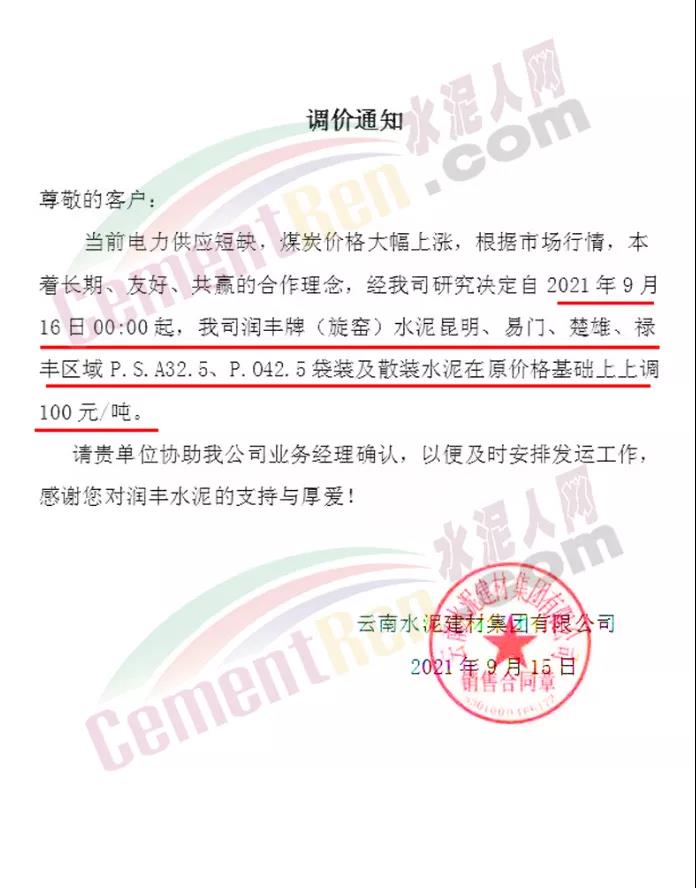云南水泥建材集團(tuán)有限公司通知,當(dāng)前電力供應(yīng)短缺,煤炭價(jià)格大幅上漲,根據(jù)市場行情,本著長期、友好、共贏的合作理念,經(jīng)公司研究決定自2021年9月 16日0時(shí)起,公司潤豐牌(旋窯)水泥昆明、易門、楚雄、祿豐區(qū)域P.S.A32.5、P.042.5袋裝及散裝水泥在原價(jià)格基礎(chǔ)上上調(diào)100元/噸。