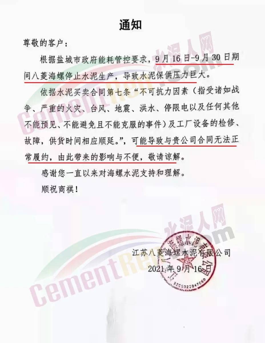 昨日(9月16日)八菱海螺發(fā)通知稱,根據(jù)江蘇省鹽城市政府能耗管控要求,9月16日-9月30日期間八菱海螺停止水泥生產(chǎn),導(dǎo)致水泥保供壓力巨大。