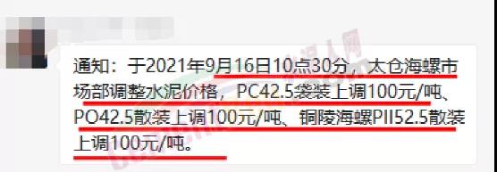 海螺市場部通知于2021年9月16日10點30分,太倉海螺市場部調(diào)整水泥價格,PC42.5袋裝上調(diào)100元/噸、PO42.5散裝上調(diào)100元/噸、銅陵海螺PII52.5散裝上調(diào)100元/噸。