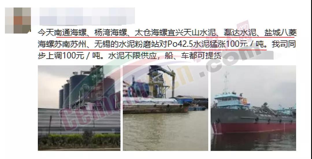 同日,江蘇省內(nèi)多家水泥企業(yè)集體通知上調(diào)水泥價格100元/噸。