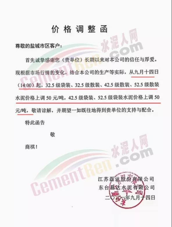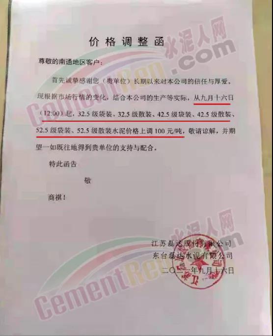 江陰綺星水泥有限公司通知,自9月16日12時起,所有等級水泥統(tǒng)一上調(diào)100元/噸。