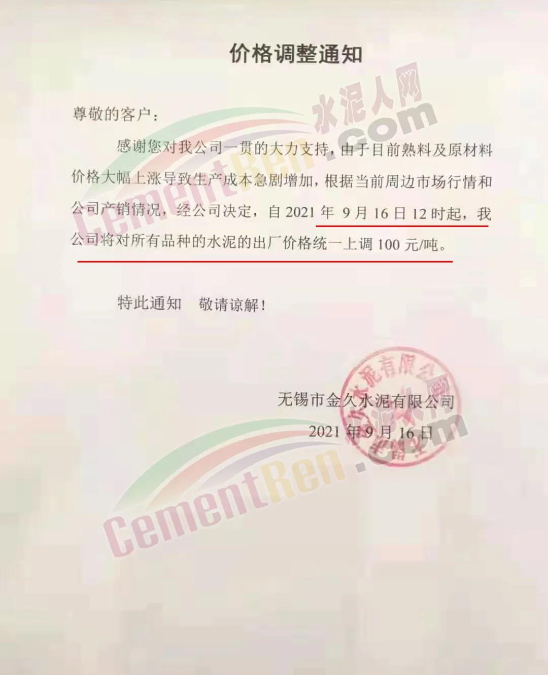 無錫市天裕建材有限公司通知,自9月16日12時起,公司對所有品種水泥出廠價上調(diào)100元/噸。