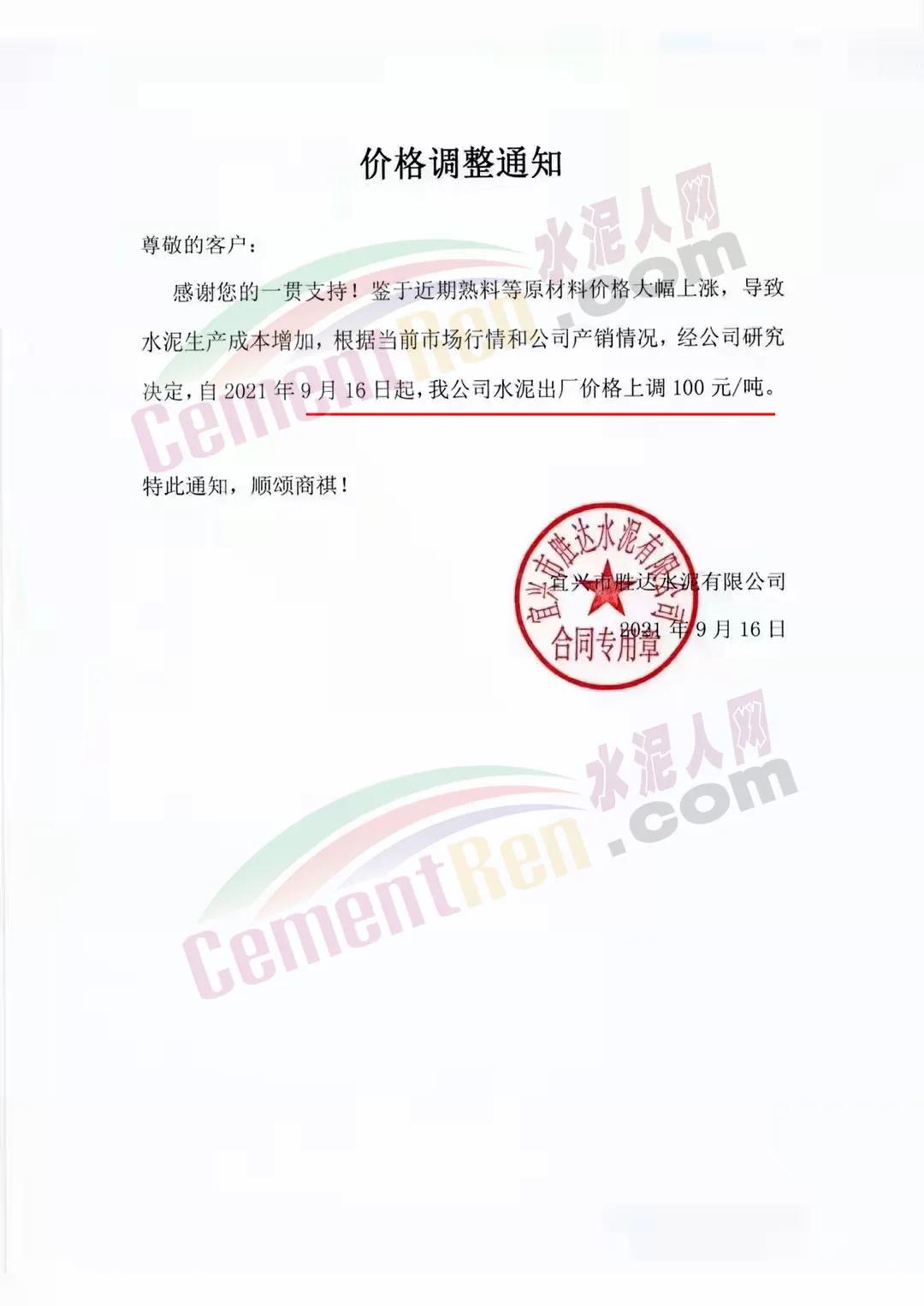 宜興市勝達水泥通知,鑒于近期熟料等原材料價格大幅上漲,導(dǎo)致水泥生產(chǎn)成本增加,根據(jù)當前市場行情和公司產(chǎn)銷情況,經(jīng)公司研究決定自9月16日起,公司水泥出廠價格上調(diào)100元/噸。