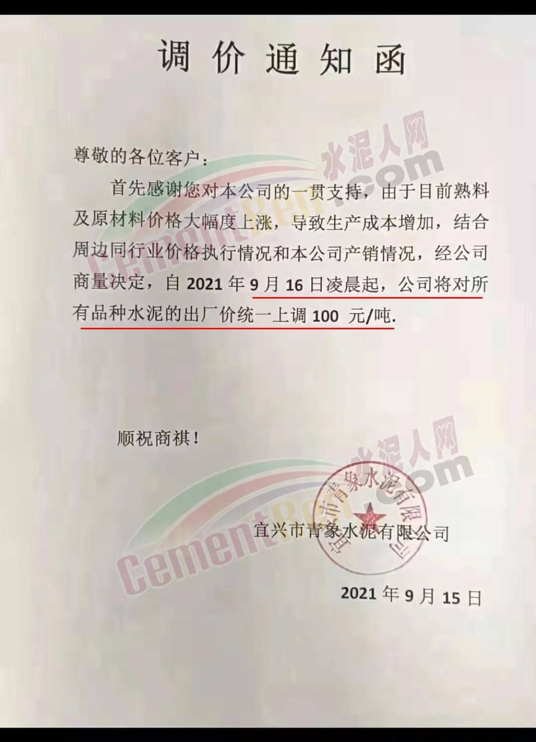 宜興市青象水泥有限公司通知,自9月16日凌晨起,公司對所有品種水泥的出廠價統(tǒng)一上調(diào)100元/噸。