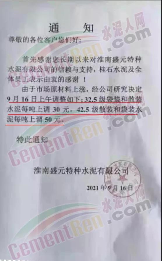 淮南盛元特種水泥有限公司通知,自9月16日起32.5水泥上調(diào)30元/噸,42.5水泥上調(diào)50元/噸。